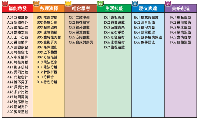 全系統長程規劃教學,超學科、跨領域,「59 項子目錄」科學排序的學習內容,「450盒腦力開發」統合式的完全操作。
