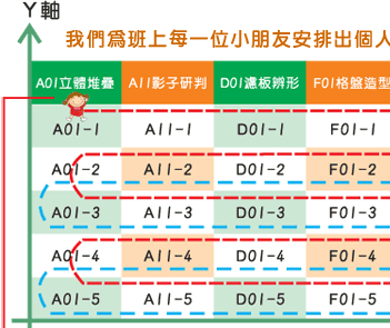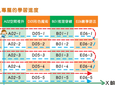 第一階段為 59 項子目錄單向排序(縱軸),第二階段為螺旋式二度排序(橫軸)。更藉由精心設計的學習進度手冊,讓教師在上課時完全掌握個別進度,不會發生重複學習或進度重疊的狀況。