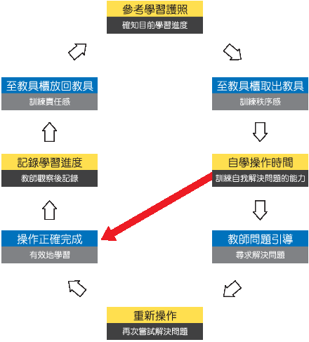 特別強調自我控速與循序漸進,讓孩子藉由精密的難易度課程鋪排建立信心,在遊戲教具的實物操作中親身體會,由內而外激發潛能培養實用的能力。