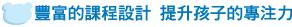 因為傑立卡課程可以讓孩子單獨操作,依照自己的進度學習,而課程設計得豐富多變,每個寶盒裡面都有不同、有趣的題目等著孩子去挑戰,強烈地吸引孩子的好奇心,所以每次上課時,孩子們總是專心地投入傑立卡課程中。指導傑立卡課程的老師表示,有一些注意力比較差的孩子,經由傑立卡的訓練後,都慢慢改善了分心的小毛病,而一些比較活潑、過動的孩子,也會因為傑立卡而靜下心來操作教具。 |